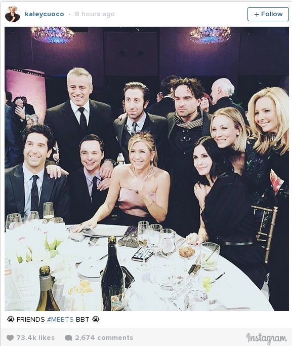 Χάρη στην Κάιλι Κουόκο, οι φαν της σειράς είδαν ξανά τους πρωταγωνιστές από τα «Φιλαράκια» τα διασκεδάζουν μαζί. Η σταρ του «The Big Bang Theory» φωτογράφισε τους πέντε τους, μαζί με τους δικούς της συμπρωταγωνιστές και δημοσίευσε τη φωτογραφία στο Instagram.