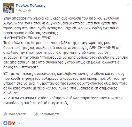 στο Facebook ο Παύλος Πολάκης την ανακοίνωση του Ιατρικού Συλλόγου